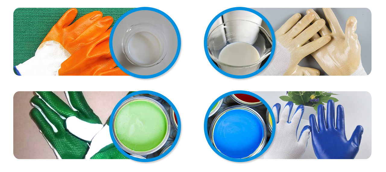 该类产品主要应用于劳保手套浸渍,有着耐磨光泽度高,柔韧度好的特点。